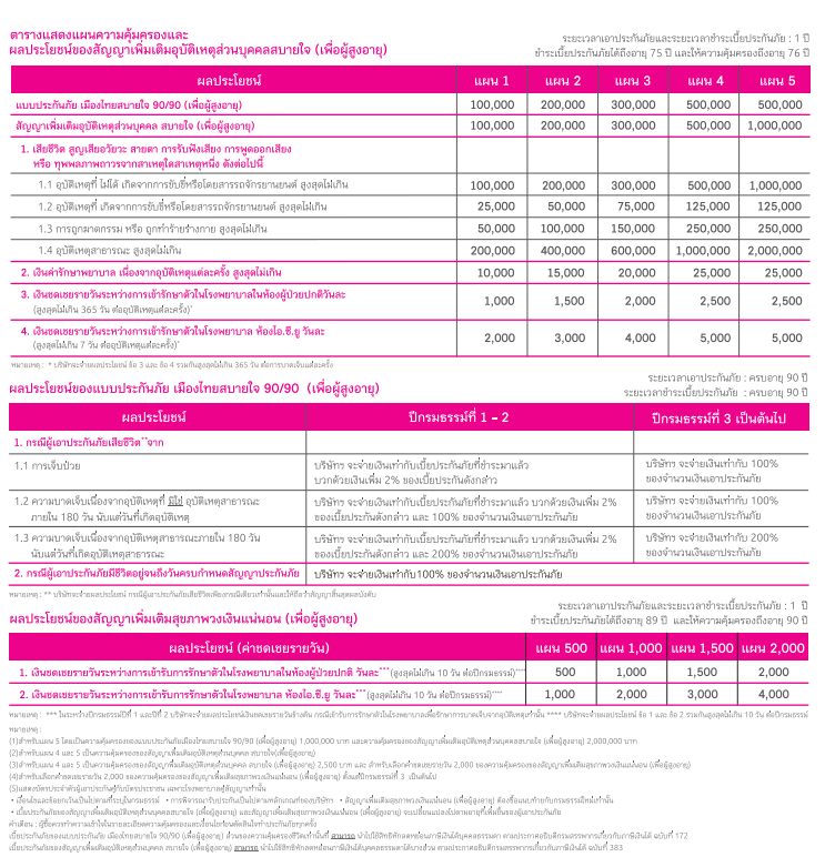 - สัญญาเพิ่มเติมอุบัติเหตุส่วนบุคคล สบายใจ (เพื่อผู้สูงอายุ) : 1 ปี (ชำระเบี้ยประกันภัยได้ถึงอายุ 75 ปี และให้ความคุ้มครองถึงอายุ 76 ปี)