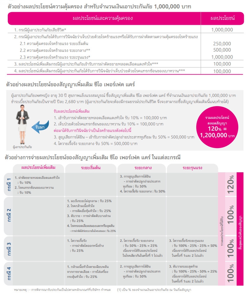 สัญญาเพิ่มเติมซีไอเพอร์เฟค แคร์ ประกันโรคร้ายแรง 36 โรค จ่ายทุกระยะ คุ้มครองเสียชีวิตหรือตรวจพบโรคร้ายแรงตั้งแต่ 30 วัน - 65 ปี หากเสียชีวิตประกันโรคร้ายแรงซีไอเพอร์เฟคแคร์จ่ายทันที 100% หรือตรวจพบโรคร้ายแรงจ่ายตามระยะ 10%-100% ทันที และประกันโรคร้ายซีไอเพอร์เฟคแคร์คุ้มครองโรคร้ายถึงอายุ 85 ปี