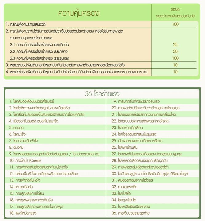 - คุ้มครองโรคร้ายแรงครอบคลุมระยะเริ่มต้นถึงระยะสุดท้าย 36 โรค