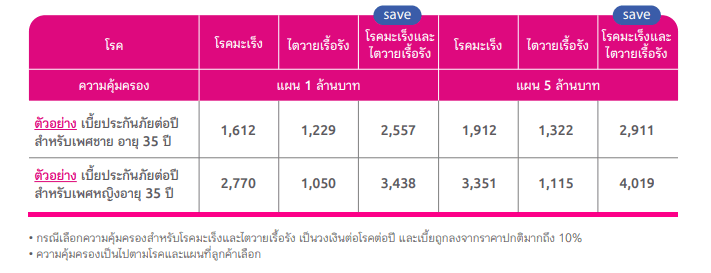 - เลือกความคุ้มครองโรคร้ายแรงได้ตามต้องการ หากเลือกทั้ง 2 โรค เบี้ยถูกลงถึง 10%