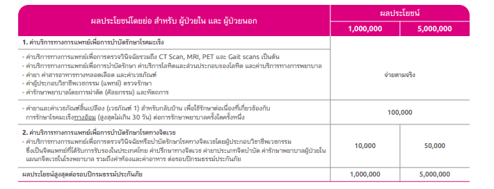 - ผลประโยชน์สูงสุดต่อการรักษาโรคมะเร็ง รวมทุกสัญญา และ รวมทุกช่องทางแล้วจะต้องไม่เกิน 5,000,000 บาท ต่อผู้ขอเอาประกันภัยแต่ละคน