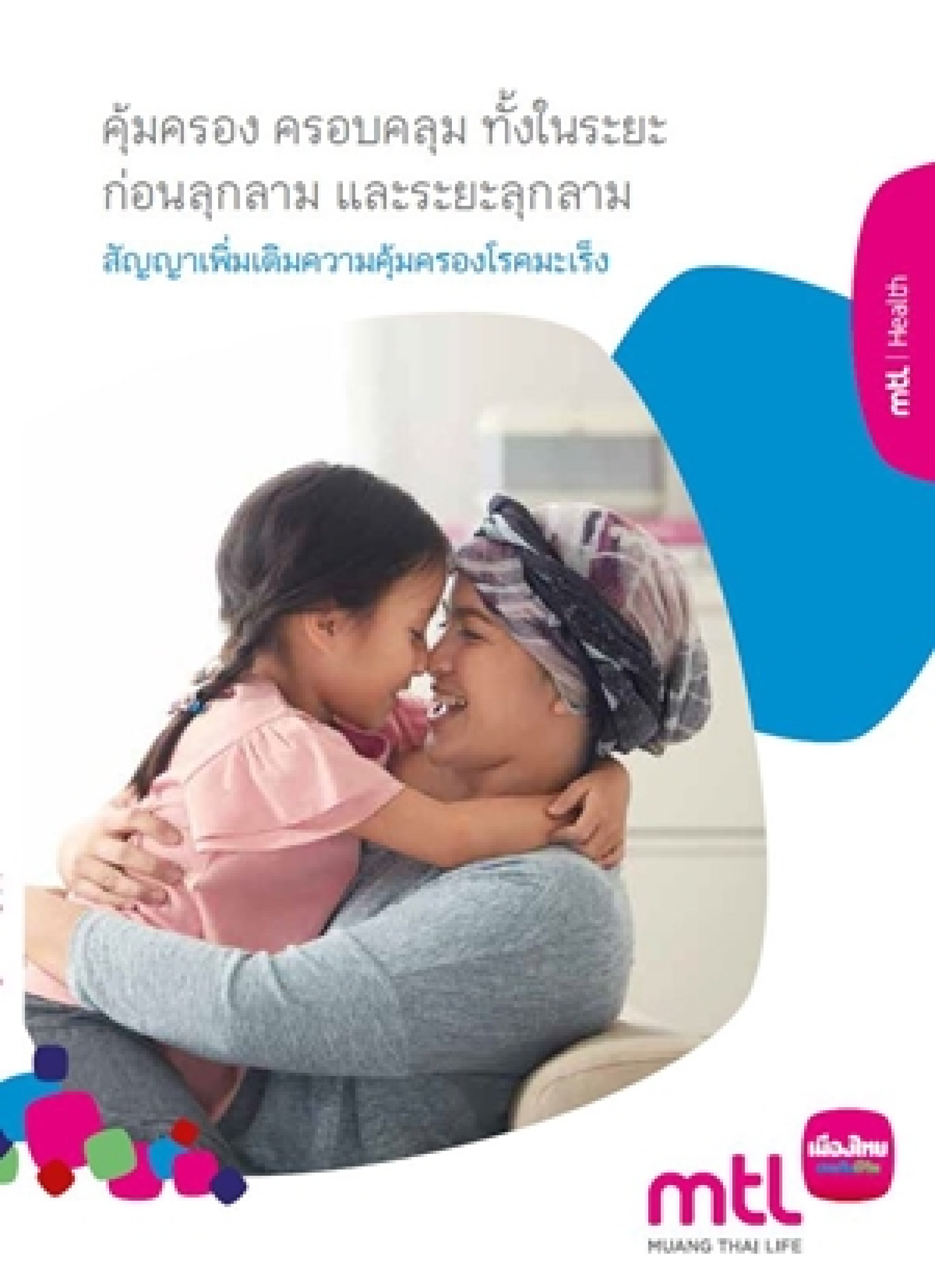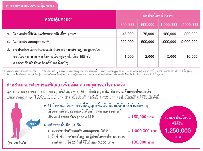 สัญญาเพิ่มเติมคุ้มครองโรคมะเร็ง คุ้มครอง ครอบคลุมทั้งในระยะก่อนลุกลามและระยะลุกลาม พร้อมค่าชดเชยนอนโรงพยาบาลสูงสุดวันละ 10,000 บาท