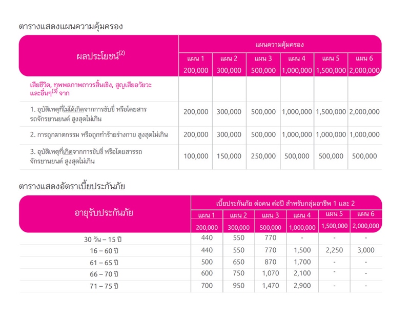 - เกณฑ์อายุที่รับประกันได้ : อายุ 1 เดือน - 75 ปีบริบูรณ์ (อายุ 1 เดือน ถึง 15 ปี รับประกันได้สูงสุด 500,000 บาท และอายุ 60 ปีขึ้นไป รับประกันได้สูงสุด 1,000,000 บาท)